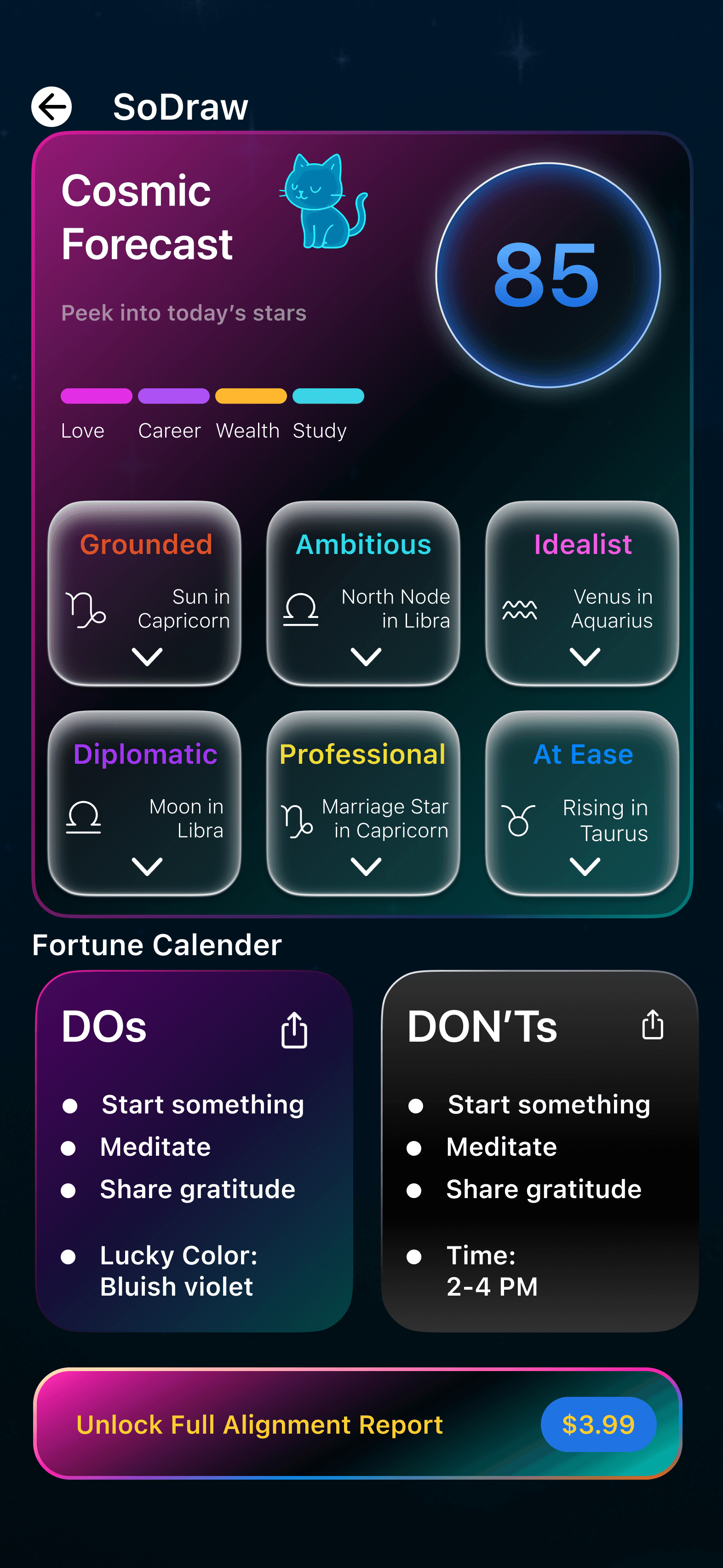 Early explorations centered on surfacing as much fortune information as possible on the home screen. While this increased the visibility of features, it diluted the ritual-like entry moment and created competing focal points.